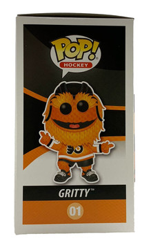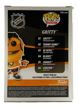 Looking at the front of the box you can see on the top you have the Pop! logo on the left with the Philadelphia Flyers wordmark in the middle and the number #1 as this is the 1st figure in this NHL Mascots line. There is a nice big window that displays Gritty for one who wishes to display his inbox. On the bottom, there is a nice cartoon drawing of Gritty with his name running along the bottom of the box. Turning the box to the left you can again see the Pop! logo, The same artwork from the front only now a full-sized picture of it with his name and figure number below him. The back of the box also gives you a list of the rest of the Mascots from this new line, #1 Gritty (Philadelphia Flyers), #2 Tommy Hawk (Chicago Blackhawks), #3 NJ Devil (New Jersey Devils), #4 Blades (Boston Bruins), #5 Chance (Vegas Golden Knights) and #6 Carlton (Maple Leafs). If you are one who wants to keep the Pop the inbox you turn the box around one more time you get a nice wrap-around of the window to show off Gritty. This is a nice feature for people who like to keep the Pop figures mint inbox.
